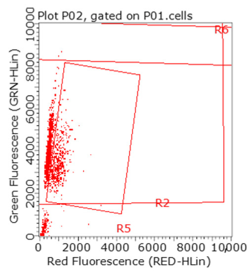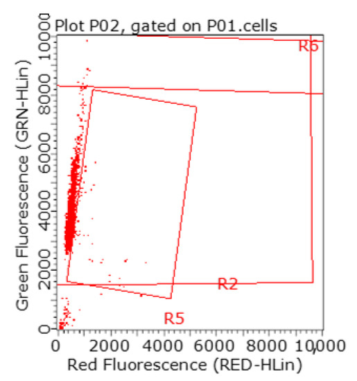 An example of a dot plot with 29.85 percent of spermatozoa with DNA fragmentation in the red rectangle in the Control group, determined according to the DNA fragmentation index (% DFI).