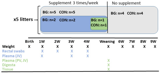 An overview of the experimental set-up is shown in Figure 1. Weight gain was recorded for all piglets on a weekly basis from birth until nine weeks of age, with an extra weight measurement on the day of weaning. Four piglets per litter, two from each treatment, balanced for sex and weight between treatments, were selected for collection of faecal microbiota samples using rectal swabs (E-Swabs, Copan Diagnostics) at 1, 2, 3, and 4 weeks of age. The swabs were immediately placed on ice after sampling and within 2 h were transferred to a freezer and stored at −80 °C until analysis. Blood samples from the jugular vein of the same piglets were collected at 1, 3, and 4 weeks of age, using a 21G vacutainer needle and 4 mL VenoSafe Vacutainer EDTA-tubes. After centrifugation for 20 min at 4 °C and 1500× g, plasma was collected and stored at −80 °C until analysis. The oral supplementation and sampling were performed consecutively. Due to obvious differences in the characteristics of the supplements, the individual collecting the samples was not blind to the treatment. However, the individual performing the laboratory analyses was blind to the treatments, reducing any potential bias in outcome for the two treatment groups. Piglets that needed treatment with antimicrobial drugs were excluded from the study.