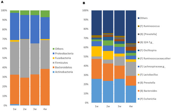 Stacked bar plot showing relative abundance of (A) the five most abundant bacterial phyla and (B) the 10 most abundant genera in rectal swab samples collected from piglets over the whole suckling period. Others = remaining accumulated abundance of bacterial taxa not among the top 10 in abundance in the samples, B = Bacteroidetes, F = Firmicutes, P = Proteobacteria.