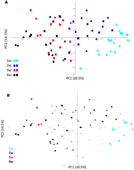 (A,B) Principal coordinates analysis (PCoA) plots with BrayCurtis distances showing microbiota development in 20 piglets (swab samples) from 1–4 weeks of age (10 receiving a β-glucan (BG) supplement and 10 from the control group (CON)). Symbols in plot (A) represent different treatments (circles = BG, squares = CON) and symbols (squares, diamonds, circles, triangles and stars) in plot (B) different litters.