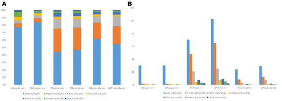 (A) Relative concentrations (% of total) and (B) mean absolute concentrations (μmol/g) of SCFA and caproic acid in jugular vein and portal vein plasma and colon digesta from 10 euthanized piglets (five piglets in a group receiving a β-glucan supplement and five control (CON) piglets.