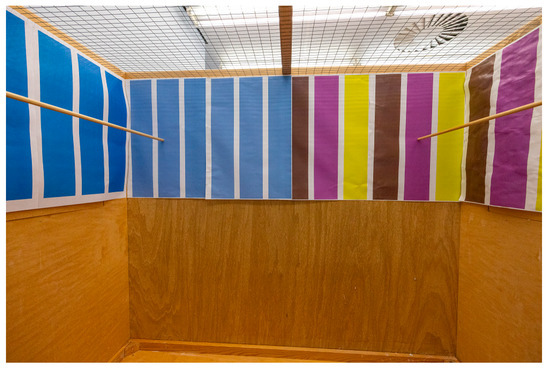 Experiments took place in an experimental room adjacent to the housing room, which contained six similarly sized flight cages (120 cm × 70 cm × 100 cm) with three wooden walls and a front and wire mesh ceiling. Cages were arranged so that birds could hear but not see each other and contained two upper perches, left and right, in the cage and a lower perch close to the bottom, which was only used by the birds when going for a bath. Food and water were provided in the middle of the wire mesh front. Each cage had two background patterns. Half of the rear wall and the adjacent side wall were covered with a simple background pattern, and the other half of the rear wall and adjacent side wall were covered with a complex background pattern (Figure 1). Backgrounds were designed in Adobe Photoshop 2018. Both background patterns consisted of vertical stripes alternating between broad (7.9 cm) and narrow (1.9 cm) stripes to control density [34]. The colors were specifically chosen to avoid green, red, and black as the backs of the birds were mostly green and the latter two differed between the color morphs. This allowed specifically testing for simple vs. complex patterns, excluding color matching, which is difficult in this colorful species. As the finches have tetrachromatic vision, including in the ultraviolet range [48], matching background colors to their plumage is further hampered. The simple background alternated broad light blue (#7d8beb) stripes with white stripes, whereas the complex background had a pattern of broad yellow (#e2eb0c), purple (#cd4fff), and brown (#5d4028) stripes separated by narrow white stripes. The lightness of backgrounds was compared using the Lab Color mode in Adobe Photoshop. The simple background had a lightness of 60 for each stripe, whereas the complex background had an overall lightness of 60 calculated as the average of yellow, brown, and purple lightness (90 + 30 + 60/3). The backgrounds were printed on 60 × 40 cm paper and attached to the walls. The position of the complex and simple backgrounds (on the left or right side of the cage) alternated between cages. A video camera was mounted in front of each cage. Overall, four cages were used at a time.
