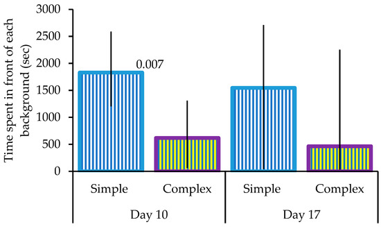 Background preferences. The median and quartiles of time spent in front of the simple and complex background at the end of phase 1 (day 10) and the end of phase 2 (day 17). Significant differences are shown.