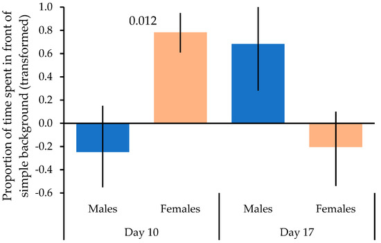 The repeated measures ANOVA investigating changes in preference over time and the effects of head color, sex, and age showed that the interaction between habituation x and sex was significant (repeated measures ANOVA: n = 19, F = 7.292, p = 0.018). Females spent significantly more time in front of the simple background at the end of phase 1 (day 10) as compared to the males (t = −2.906, p = 0.012), whereas the sexes did not differ significantly in their background preference from each other at the end of phase 2 (day 17; F = 1.531, p = 0.150; Figure 3). However, the paired t-test comparing preferences on days 10 and 17 for each sex separately indicated that females showed a significant change in preference from spending much more time in front of the simple background in phase 1 to spending similar amounts in front of both backgrounds or even a bit more time in front of the complex background in phase 2 (paired t-test: t12,1 = 2.734, p = 0.019; Figure 3). In contrast, changes in preferences among males were not significant (t7,1 = −1.553, p = 0.171; Figure 3).