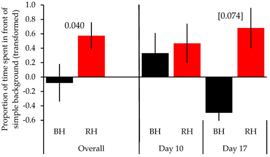 Moreover, head color had a significant effect (F = 5.187, p = 0.040), with black-headed birds overall showing no clear preference for either background, whereas red-headed birds preferred the simple background. These differences were primarily driven by a trend among the black-headed birds to spend more time in front of the complex background at the end of phase 2 (day 17; t = −1.944, p = 0.074; Figure 4) as compared to the red-headed birds. No significant differences between head colors were present at the end of phase 1 (day 10; t = −0.730, p = 0.478; Figure 4). No other factors had an effect (Table 1).