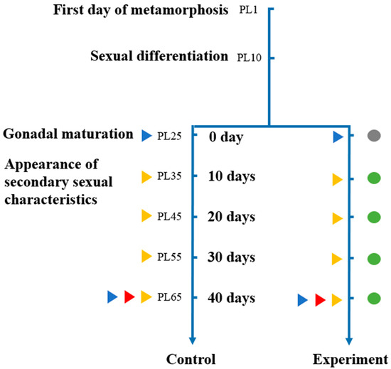 Experimental design. Yellow triangles represent the sex ratio statistic stage, red triangles represent the histological sampling stage, and blue triangles represent the growth data collection stage. The gray circle indicates that secondary sexual characteristics have not appeared and the green circles indicate that secondary sexual characteristics have appeared.