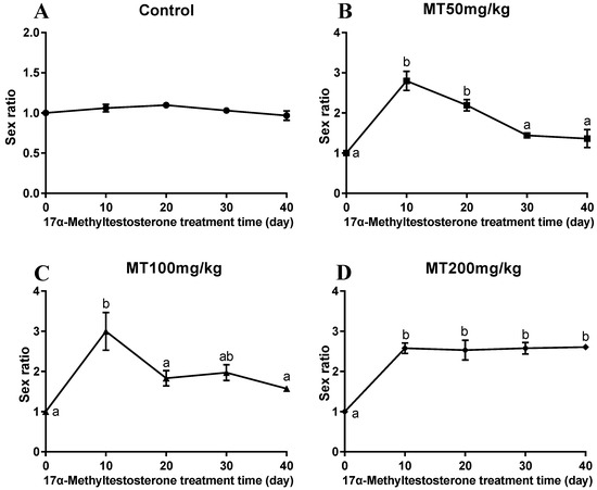 The sex ratio at four different concentrations of MT over time. (A) Control; (B) 50 mg/kg MT; (C) 100 mg/kg MT; (D) 200 mg/kg MT. Data are shown as mean ± SEM of tissues from separate individuals (n = 3). Lowercase letters indicate differences in expression between different samples in the same group.