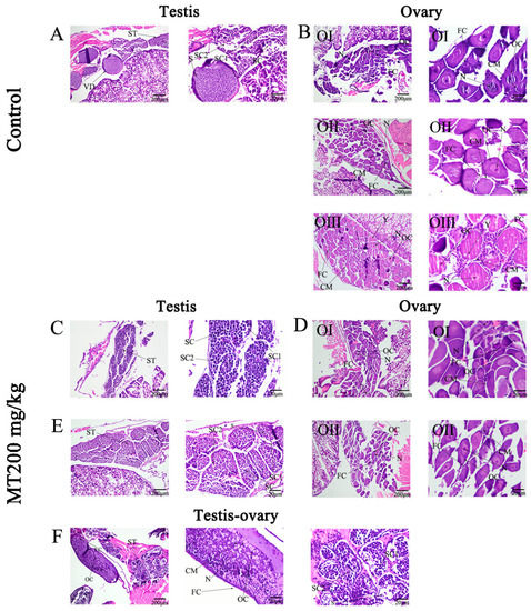 Histological sections of (A) male prawn testis in the control, (B) oocyte I, oocyte II and oocyte II of female prawns in the control, (C,E) testis of male prawns in the 200 mg/kg MT group, (D) oocyte I and oocyte II of female prawns in the 200 mg/kg MT group, and (F) testis–ovary of male prawns in the 200 mg/kg MT group. N: nucleus; ST: spermatid; SC: spermatocyte; SC1: primary spermatocyte; SC2: second spermatocyte; S: sperm; VD: vas deferens; OC: ovarian cavity; FC: follicle cells; CM: cytoplasmic membrane; Y: yolk granule. Scale bars: 200 µm and 20 µm.