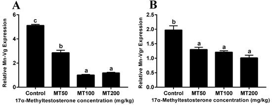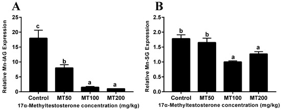 All the samples measured were whole prawns that came from three separate individuals in the same group. As shown in Figure 4, Mn-IAG and Mn-SG mRNA levels in males were measured at 40 days after different concentrations of MT. An increase in MT concentration dramatically decreased the expression levels of Mn-IAG. The expression characterization of Mn-IAG in experimental groups was lower than the control (p < 0.05). Moreover, the expression level of Mn-IAG in the control group was 17.9-fold greater than that in the 200 mg/kg MT group. The expression of Mn-SG in the 100 and 200 mg/kg MT groups was relatively low and significantly different from that of the control and 50 mg/kg MT groups (p < 0.05). As shown in Figure 5, Mn-Vg and Mn-Vgr mRNA levels in females were measured at 40 days after different concentrations of MT were administered. Increases in MT concentration dramatically decreased the expression levels of Mn-Vg and Mn-Vgr. The expression levels of Mn-Vg and Mn-Vgr at 100 and 200 mg/kg MT were similar, and both were significantly different from the control (p < 0.05).