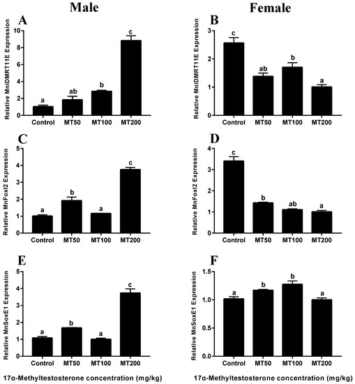 Expression characterization of MniDMRT11E, MnFoxl2, and MnSoxE1 in male and female prawns treated with different concentrations of MT for 40 days. (A,C,E) Expression levels of MniDMRT11E, MnSoxE1, and MnFoxl2 in male prawns treated with different concentrations of MT for 40 days; (B,D,F) expression levels of MniDMRT11E, MnSoxE1, and MnFoxl2 in female prawns treated with different concentrations of MT for 40 days. The amount of MniDMRT11E, MnFoxl2, and MnSoxE1 mRNA was normalized to the EIF transcript level. Data are shown as mean ± SEM of whole prawns from separate individuals in the same group (n = 3). Lowercase letters indicate the difference in expression between different samples.
