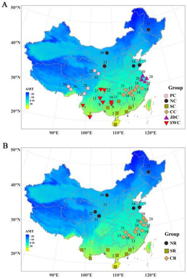 Geographical distributions of 37 Chinese indigenous pig breeds. Thirty-seven populations of Chinese indigenous pigs: 1, Wuzhishan pig; 2, Diannanxiaoer pig; 3, Luchuan pig; 4, Guangdongdahuabai pig; 5, Lantang pig; 6, Bamaxiang pig; 7, Mingguangxiaoer pig; 8, Congjiangxiang pig; 9, Guanling pig; 10, Xiang pig; 11, Dongshan pig; 12, Kele pig; 13, Leanhua pig; 14, Diqing Tibetan pig; 15, Shaziling pig; 16, Ganxiliangtouwu pig; 17, Nanchang Wild Boar pig; 18, Leping Spotted pig; 19, Jinhua pig; 20, Milin Tibetan pig; 21, Tongcheng pig; 22, Rongchang pig; 23, Neijiang pig; 24, Wannan Spotted pig; 25, Litang Tibetan pig; 26, Gongbujiangda Tibetan pig; 27, Sutai pig; 28, Meishan pig; 29, Erhualian pig; 30, Jiangquhai pig; 31, Tibetan pig; 32, Gansu Tibetan pig; 33, Bamei pig; 34, Laiwuhei pig; 35, Lichahei pig; 36, Hetaodaer pig; and 37, Min pig. (A) Six geographically isolated Chinese indigenous pig meta-populations: PC, Plateau of China; NC, North China; SC, Southern China; CC, Central China; JDC, Jianghai district of China; and SWC, Southwestern China. (B) Three climatically isolated Chinese indigenous pig meta-populations: NR, northern region; SR, southern region; and CR, central region.