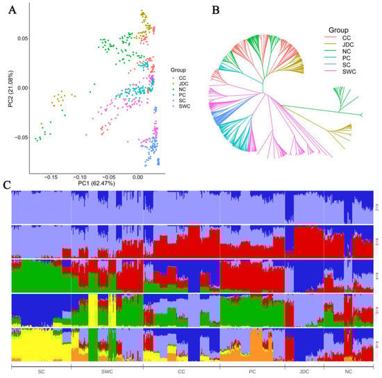 According to their geographic origin and characteristics, Chinese indigenous pigs were divided into six geographically isolated meta-populations (Figure 1A) [23,24,25,26]. Principal component analysis based on whole-genome-wide SNPs revealed that the six meta-populations were relatively mixed (Figure 2A). Principal component 1 (PC1) captured 62.47% of the variance and separated some individuals in the Jianghai district of China (JDC) and North China (NC) from the main cluster. Interestingly, PC2 arranged the six meta-populations into groups somewhat consistent with their geographic origin with the Southern China (SC) and Southwestern China (SWC) meta-populations having maximum negative values and the NC and JDC meta-populations having maximum positive values (Figure 2A). Moreover, clear population admixture was seen in phylogenetic clustering (Figure 2B) and population structure (Figure 2C). A possible reason for this result is that the occupation of adjacent regions facilitates gene flow among these pig breeds. A population structure analysis provided evidence for introgression from exotic ancestry into Chinese indigenous pigs (Figure 2C), consistent with previous studies [27]. In addition, there were more genetic components in the SWC and CC meta-populations, which was consistent with the results of a frequent gene exchange in southern China [28]. The SC meta-population had unique genetic features compared to the others (Figure 2B,C), which could result from unique selective pressures from the hot and humid climate and from artificial selection for a small body size by humans [29] or long-term ancestral isolation.