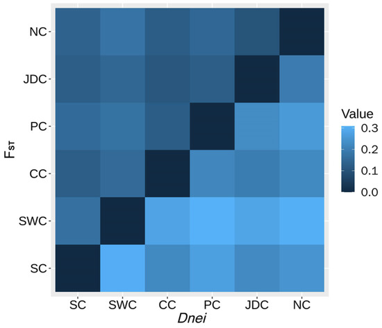 Heatmap plot of Nei’s minimum genetic distance Dnei (lower) and gene frequency differentiation index FST (upper). The population abbreviations are as in Figure 1A.