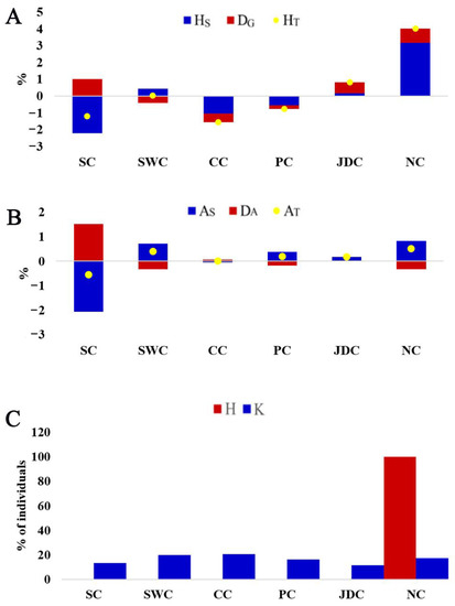 Maintenance of maximum genetic diversity is an important goal of conservation to maintain the potential for adaptation to environmental changes in the future [30]. Expected heterozygosity and allelic diversity measure genetic diversity, and they are susceptible to selection intensity and the influence of bottlenecks, respectively [31]. The contribution of each meta-population to the global genetic diversity was determined by calculating the change in genetic and allelic diversity, removing one subpopulation from all meta-populations before the calculation. When a subpopulation is removed, the positive and negative contribution values represent the loss and gain of diversity, respectively [18]. These positive and negative values can be used to rank the conservation priority of the subpopulation. Conservation priority based on contribution rank to total diversity within the meta-populations was similar for total heterozygosity and allelic diversity (Figure 4). The removal of the NC meta-population resulted in the highest loss of total heterozygosity (HT, 4.0108%) followed by the JDC meta-population (HT, 0.8306%) (Figure 4A). Furthermore, the NC and SWC meta-populations had the first-(0.5118%) and second-(0.3959%) highest contribution to the loss of total allelic diversity (AT), respectively. The CC meta-population had the highest percentage of HT (−1.5417%), and the percentage of AT was the highest in the SC meta-population (−0.5499%). The SC meta-population had lower within-population diversity because it had the most significant negative contributions to both HS (−2.1954%) and AS (−2.0666%) (Figure 4A,B). Moreover, the SC meta-population had the highest average co-ancestry (fii: 0.7676), which corresponds to the above results for population diversity (Table 1). The NC meta-population had the largest within-population diversity based on the highest values of positive contribution to both HS (3.1711%) and AS (0.8303%). Additionally, the largest within-population diversity corresponded to a low average co-ancestry (fii: 0.6817) in the NC meta-population (Table 1). The maximum value of expected heterozygosity roughly corresponded to the minimum value of average co-ancestry [32]. However, the lowest negative contribution to DG (−0.4937%) was observed in the CC meta-population, which is consistent with the CC meta-population having the smallest average Nei’s distance compared with the others (Dnei: 0.02712) (Figure 3). Based on maximum expected heterozygosity and total number of alleles, we calculated the contribution of each meta-population to the total meta-population gene pool (Figure 4C). As expected, the NC population had the highest contribution to allelic diversity (K). For genetic diversity, the NC population contributed 100%, and all six meta-populations contributed greater than 10% to allelic diversity. Overall, the above evidence suggests that the NC meta-population should be given the highest priority in a conservation plan for Chinese indigenous pigs. We should strengthen the research and application of indigenous pigs in North China, promote the re-innovation of pig germplasms, and speed up the development of local pig industries.