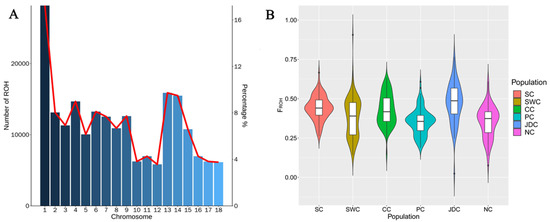 A total of 207,141 ROHs were identified in the 613 pigs by detectRUNS, and the mean length for each ROH was 2.91 Mb. The number of ROHs on each pig chromosome is displayed in Figure 5A. Figure 5A illustrates that the number of ROH fragments may be related to chromosome length for each chromosome. The individual genomic inbreeding coefficient (FROH) for the pig meta-populations within geographic regions is shown in Figure 5B. The NC (0.3533) and PC (0.3536) meta-populations had a lower average inbreeding coefficient due to their wide distribution, indicating the possible influence of geographical distribution on inbreeding coefficients. The JDC meta-population had the highest average inbreeding coefficient (Table 1, 0.4748), but the number of ROH segments in this population was the lowest (Table 2). These results indicate that this population had a greater number of long ROH segments and had recently experienced higher inbreeding than the other meta-populations. This finding may be related to the close physical distance of breeds in the JDC meta-population. These results may indicate that reducing inbreeding among species and improving population diversity can be achieved by increasing the physical distance between species.