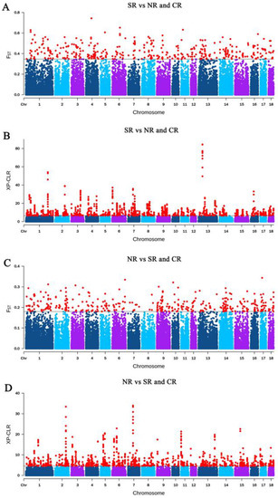 Selective sweep analysis for three climatically isolated Chinese indigenous pig meta-populations by using FST and XP-CLR (Manhattan map of FST and Manhattan map of XP-CLR.). The red dots indicate the top 1% values of FST and XP-CLR. (A) FST of SR vs. NR and CR. (B) XP-CLR of SR vs. NR and CR. (C) FST of NR vs. SR and CR. (D) XP-CLR of NR vs. SR and CR. The population abbreviations are as in Figure 1B.