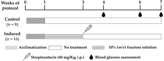 After one week of acclimatization, the rats were randomly assigned to two experimental groups: group control (n = 8) and group induced (n = 16). The experimental design was done without “nuisances”, with no need for randomized block designs. After reviewing various published papers concerning animal models of diabetes [,,], we identified a mortality rate between 20–40% and a rate of disease induction from 58% to 70%. So, to ensure the necessary sampling to have a statistical analysis power of the results, the number of animals differs between groups. This number intends to be conservative and not compromise the analysis of the results, considering Russell and Burch’s 3R principles. Thus, the number of animals per group was calculated by the Experimental Design Assistant (https://efa.nc3rs.org.uk (accessed on 1 May 2021)). A higher number of animals was used in the group induced due to the higher mortality rate expected in the animals with diabetes when compared with those animals from group control [,,,]. At 4 weeks of age (beginning of week 1), the animals from the induced group began to drink a 10% fructose solution prepared as indicated above for 14 consecutive days (two weeks). After this, all animals from both groups were exposed to a 12 h overnight fast. Then, the animals from the group induced received a single intraperitoneal administration of STZ (40 mg/kg), while the animals from group control received an injection of the vehicle (0.1 M citrate buffer). Throughout the trial, the animals had unlimited access to tap water via capped bottles and a standard laboratory diet (SAFE® Custom Diets, Augy, France). Only the bottles with the 10% (m/v) fructose solution were available to the induced animals during fructose administration (Figure 1).