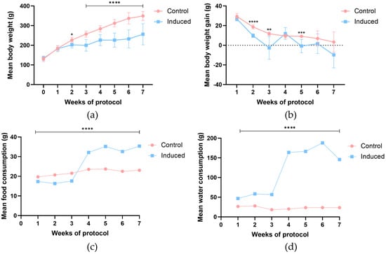 (a) Mean body weight of each group, (b) mean body weight gain, (c) mean food and (d) water consumption per day throughout the trial in both experimental groups. * Statistically different from control group (p < 0.05); ** p < 0.01; *** p < 0.001; **** p < 0.0001. The group control (n = 8) was intraperitoneally administrated with 0.1 M citrate buffer, while the induced group (n = 16) was intraperitoneally administrated with STZ diluted in 0.1 M citrate buffer after fructose feeding. Data are presented as mean ± standard deviation (SD).