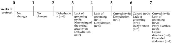 Changes observed in the animals’ welfare over time according to previously established humane endpoints. Animals from the control group did not show any change.