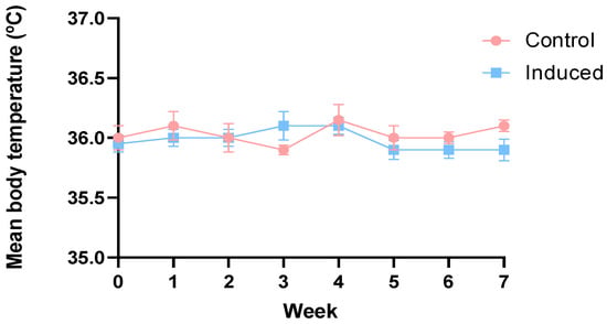 No statistically significant variations in the animals’ body temperature were reported during the trial (p > 0.05). The mean body temperature of animals from both groups ranged from 35.9 to 36.1 °C (Figure 5).