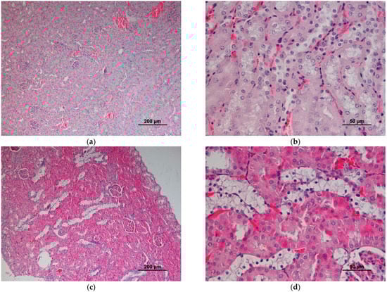 To gain a better understanding of the increase in fructose-fed and STZ-injected rat kidneys’ relative weights, a histological analysis of this organ was conducted. As illustrated in Figure 6a,b, the histology of the control animals’ kidneys showed normal glomeruli and cortical tubules. However, the histological sections of the induced animals revealed focal cell necrosis, characterized by a darkly stained cytoplasm and sloughed necrotic cells in the lumen of the cortical tubules (Figure 6c,d).