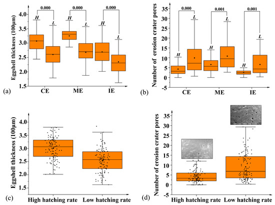 Box diagrams of the association between the hatching rate and eggshell thickness (a) and the number of erosion-crater pores (b) in the CE, ME, and IE regions, as well as the association of the hatching rate with the average number of pores (d) and average eggshell thickness (c).