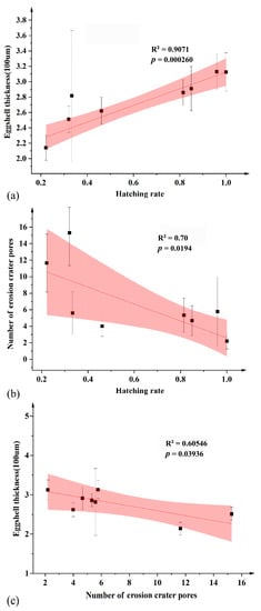 Eggshell thickness and hatching rate showed a significant positive correlation (p < 0.05) (a). The number of erosion-crater pores on the eggshell surfaces showed a significant negative correlation with the hatching rate (p < 0.05) (b). Eggshell thickness and the number of erosion-crater pores were significantly negatively correlated (p < 0.05) (c).