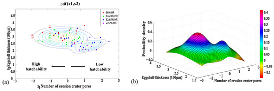 Gaussian mixture model used to cluster the eggs with similar hatching rates (HRs) according to the number of erosion-crater pores and the eggshell thicknesses (a,b) in the CE, ME, and IE regions.