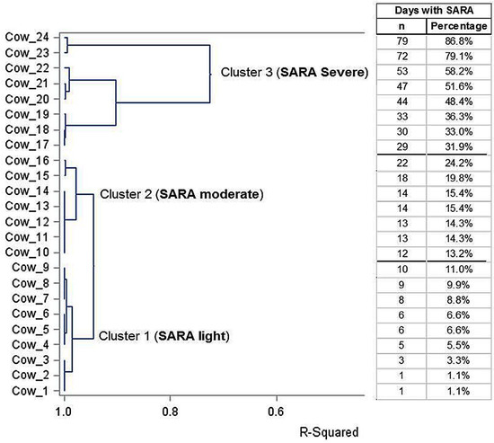 Classification of SARA severity was performed retrospectively based on the percentage of the days the cows experienced SARA, as the duration of SARA has been related to its severity [14,28]. For the classification, the data of the percentage of the days with SARA underwent a cluster analysis using the procedures of distance (PROC DISTANCE) and cluster (PROC CLUSTER) in SAS (version 9.4, SAS Institute Inc., Cary, NC, USA). First, the procedure distance computed the distance matrix of the percentage days of SARA among cows, called the Euclidian distances. The proximity measure was computed using the respective standard deviation. Thereafter, the cluster procedure performed a Ward’s minimum-variance cluster analysis based on the distance matrix created before by the proc distance. The heights of the dendrograms were specified using the R2 method (0 to 1 with 1).