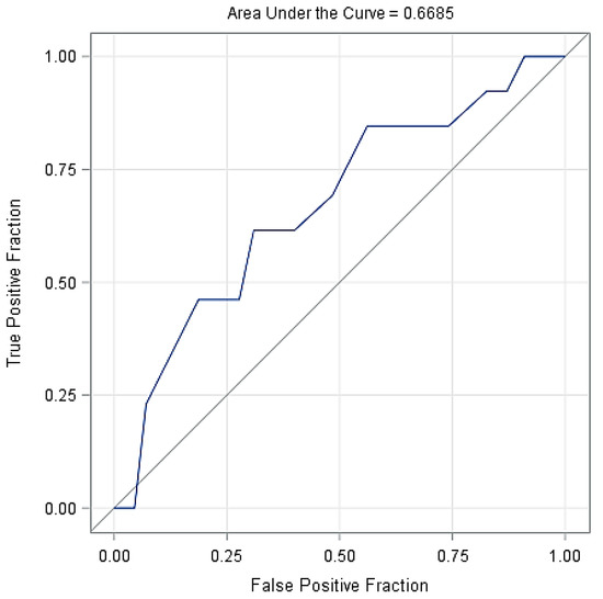 Figure 2 shows the probability of lameness in the cows based on the days with SARA, indicating that longer duration of SARA increased considerably the probability of cows becoming lame. Figure 3 shows the ROC curve at various decision thresholds and the AUC of the model. With around 66.9% AUC, the model has a satisfactory overall prediction power.
