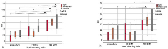 The sum of CCS in all three SARA groups increased over the observation period from before calving to three months after the end of the feeding study (160 DIM), assuming that there was a tendency for deterioration in claw health. Further, the CCS values in the severe SARA group were clearly higher compared with those in the SARA groups light and moderate (Figure 4a,b; Table 5). At hoof trimming visit 3, the mean CCS values were higher in all three SARA groups compared to visit 1. No SARA group showed statistically significant differences (p = 0.245) from any other group within the three hoof trimming visits. However, statistically significant differences in the CCS values were found when comparing hoof trimming visit 1 with visit 3 (p = 0.005) in the light SARA group, comparing visit 1 with visit 3 (p = 0.010) and visit 2 with visit 3 (p = 0.009) in the moderate SARA group, and visit 1 with visit 3 (p = 0.001) and visit 2 with visit 3 in the severe SARA group (p = 0.037) (Figure 4a).