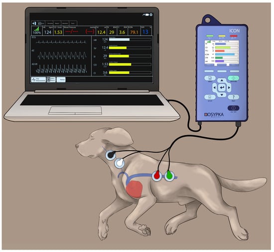 Cardiotronic electrode placement in a Beagle dog placed in the right lateral recumbency while using the electrical cardiometry (EC) monitor (ICON; Osypka Medical Inc., La Jolla, CA, USA). The electrodes are attached to an adhesive patch. The area on the left side of the neck adjacent to the common carotid artery and the left lower aspect of the thorax are clipped, thoroughly cleaned and dried before the application of the adhesive patch. The electrodes are connected to the ICON EC monitor by a cable and the monitor is synced with the laptop using an external communication cable to provide easy data management.