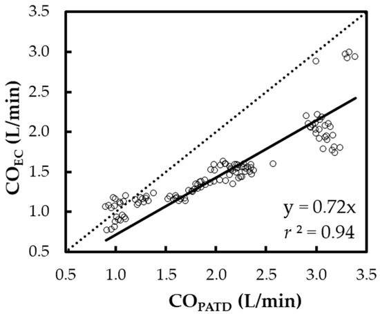 The regression in line Y = X (Figure 4) yields the expression: COEC = 0.72 × COPATD (r2 = 0.94). A positive mean relative bias (27.7%) and slope (<1) about Y = X indicates the EC underpredicts the CO when compared with the PATD. The Lin concordance correlation coefficient between the COPATD and COEC is ρc = 0.65 (p < 0.001).