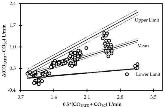 A linear regression analysis was conducted to evaluate the correlation in the measurements between the COPATD and COEC, and the Lin’s concordance correlation) was also evaluated between the PATD and EC to measure the test method’s data reproducibility [39]. Bland–Altman (BA) analysis was performed to demonstrate the agreement between the COPATD and COEC values [40]. When the mean and SD of the bias between the COEC and COPATD was influenced by the original measurement’s magnitude (proportioning effect), the BA analysis for non-uniform differences was performed. For such instances, the bias was linearly regressed against the average bias [41]. A polar plot analysis was used to illustrate the COEC‘s trending ability along with investigating the agreement between the COPATD and COEC [42,43]. The distance from the center represents the absolute values of the mean change in () and the angle with the horizontal (0° radial) indicates disagreement. A good trend is reflected by the data located within 10% of the mean CO values.