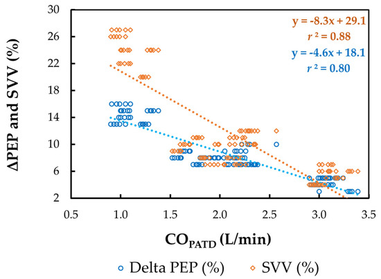 Scatterplot of cardiac output (CO) measured using pulmonary artery thermodilution (COPATD) versus stroke volume variation (SVV) and variation in pre-ejection period (ΔPEP) in six healthy, isoflurane-anesthetized Beagle dogs across five timepoints during four hemodynamic events (baseline, hemorrhage, autologous blood transfusion, and colloid infusion), thus yielding 120 paired observations. Th orange dotted line with orange solid diamonds represents the best-fit correlation for SVV and the blue dotted line with blue solid circles represents the best-fit correlation for ΔPEP.