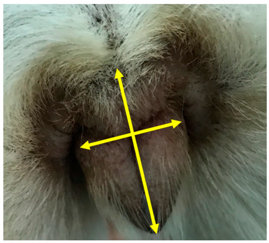 Data collection forms in Microsoft Word (See Supplementary Materials S1) were emailed to the Dog Health and Well-being staff member responsible for the bitch when the bitch reached five- or 16-months of age. Forms were completed by the veterinarian or Health and Well-being Specialist assessing the bitch either electronically or in hard copy. Data collected at the six- and 17-month assessments included height at the withers (cm) measured using an equine measuring stick, weight (kg) measured on veterinary practice scales, body condition score (BCS) measured using a 9-point scale (where a score of ‘4’ or ‘5’ represented optimum body condition at six- and 17-months, respectively), vulval measurements (length and width, cm; indicated on Figure 1) measured using a ruler, and descriptive appearance of the vulva. The following six features were assessed and recorded as either ‘0’ [not observed] or ‘1’ [observed]: vulval swelling, perivulvar skin folds, perivulvar dermatitis, vulval discharge, recessed appearance, and juvenile appearance. These scores were later combined to give a cumulative vulva score out of six; bitches with a score of ‘0’ were deemed to have a normal vulval conformation.