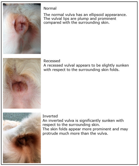 Suboptimal vulva conformation is described as a juvenile/infantile or recessed vulva and is associated with increased skin surrounding the vulva, perivulvar skin folds that can trap urine and bacteria leading to bacterial overgrowth, dermatitis and an increased incidence of urogenital disease such as urinary tract infection (UTI), cystitis, and chronic or juvenile vaginitis [4,45,46,47,48,49]. Verstegen-Onclin and Verstegen [42] presented data for 27 bitches with a history of recurrent UTI, vaginitis, and/or perivulvar dermatitis, and on examination, 85% of the bitches had a recessed or hypoplastic vulval appearance and 40% had a perivulvar skin fold. Twenty-five of the bitches were neutered; 21 before or around the time of puberty (mean age at neuter = 4.7 ± 0.3 months) and four after puberty (mean age at neuter = 2.4 ± 0.9 years). The authors proposed that neutering prior to puberty decreases the release of oestrogen and prevents the normal development of external genitalia. However, each of these cases was from a specialist referral hospital with the reason for referral unclear, therefore, the sample was potentially biased due to the study population comprising bitches with known urogenital disease. In contrast, Salmeri et al. [26] and Root-Kustritz [50] suggested that immature vulval development may not cause a clinical problem in otherwise healthy bitches.