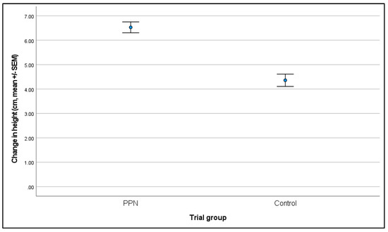 Data were available for 225 bitches (115 PPN, 110 control): the mean change in height measurement for PPN bitches was 6.53 ± 0.22 cm and for the control bitches was 4.36 ± 0.25 cm (F = 37.329, D.F. = 1, p < 0.001; Figure 5). PPN bitches had a significantly greater change in height measurements than the controls (mean difference = 2.039, SEM = 0.334, 91% CI = 1.471 to 2.608). The number of days between assessments (F = 5.816, D.F. = 1, p = 0.017) and VP (F = 2.258, D.F. = 4, p = 0.064) also impacted the change in height measurements. A one day increase in days between assessments was associated with a 0.067 unit increase in the change in height measurement (β = 0.067, SEM = 0.028, 91% CI = 0.020 to 0.115). VP3 had a smaller change in height measurements than for all the other VPs. These were significantly smaller than VP2 (mean difference = −1.002, SEM = 0.509, 91% CI = −1.869 to −0.135, p = 0.050), VP4 (mean difference = −0.985, SEM = 0.484, 91% CI = −1.810 to −0.160, p = 0.043), and for bitches that were measured by ‘Different’ VPs at six- and 17-months of age (mean difference = −1.569, SEM = 0.604, 91% CI = −2.597 to −0.540, p = 0.010).
