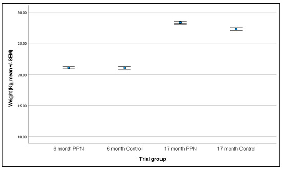 All 253 bitches with completed 17-month assessment forms had their body weight data recorded. Bitches weighed between 21.7 and 33.5 kg (mean 27.80 ± 0.1 kg). Five bitches with no height measurement and 19 bitches with potentially incorrect height measurements were excluded from analysis. Data were analysed for 229 bitches (119 PPN, 110 control). There was no significant difference in weight between the PPN and control bitches at 17-months of age (F = 1.289, D.F. = 1, p = 0.258; mean weight of PPN bitches 28.3 ± 0.2 kg and control bitches 27.3 ± 0.2 kg; Figure 6). Height (F = 39.050, D.F. = 1, p < 0.001) and VP (F = 2.747, D.F. = 4, p = 0.029) were significantly associated with body weight at 17-months of age. A one unit increase in height was associated with a 0.35 unit increase in weight (β = 0.345, SEM = 0.055, 91% CI = 0.251 to 0.440). Body weight measurements by ‘Other’ VP were significantly lower than the measurements by all four VPs. Mean differences between ‘Other’ and: VP1 were −1.758 (SEM = 0.566, 91% CI = −2.721 to −0.795, p = 0.002); VP2 were −1.328 (SEM = 0.579, 91% CI = −2.314 to −0.342, p = 0.023); VP3 were –1.733 (SEM = 0.562, 91% CI = −2.691 to −0.775, p = 0.002); VP4 were −1.399 (SEM = 0.571, 91% CI = −2.370 to −0.427, p < 0.015).