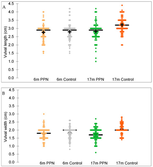 The distribution of vulval length (A) and vulval width (B) measurements at six- and 17-months of age for bitches neutered before (PPN, n = 118) or after (control, n = 109) puberty. Graphs show the mean (+) and median (straight line).