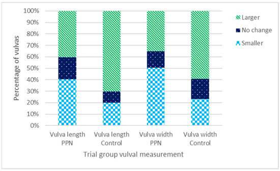 Two hundred and forty-four bitches (119 PPN, 125 control) had vulval length and width measurement data available at six- and 17-months of age. The mean change in vulval length and width for the PPN bitches was 0.08 ± 0.05 cm and −0.05 ± 0.04 cm, respectively. The mean change in vulval length and width for the control bitches was 0.39 ± 0.05 cm and 0.19 ± 0.04 cm, respectively (Table 3). Significantly more PPN than control bitch vulvas changed to be smaller and fewer changed to be larger in length (Chi-square = 22.334, D.F. = 2, p < 0.001) and width (Chi-square = 20.131, D.F. = 2, p < 0.001) between six- and 17-months of age (Figure 8).