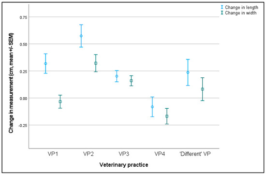 The mean (±SEM) change in the vulval length and width measurements (cm) between six- and 17-months of age for bitches that had physical assessments completed by each veterinary practice (VP) or by ‘Different’ VP for bitches that had assessments completed by different VPs at each age.