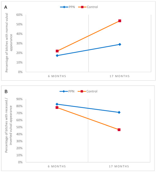 Results relating to veterinarian assessment of vulval appearance at the six- and 17-month assessments and examination of digital images of the vulva in the present study confirmed that vulva size and development are impacted by neutering before puberty. By 17-months of age, significantly more pre than post-pubertally neutered bitches had vulvas that were juvenile and recessed based on veterinary examination and more classified as recessed/inverted based on digital image examination. These findings are to be expected due to the earlier removal of oestrogen for bitches neutered before puberty, which may prevent oestrogenic influence on the maturation of the external genitalia [2,42,45]. Such anomalies in appearance are suggested to predispose to urogenital disease [4,45,46]. However, seemingly in contrast to the findings related to vulval development and the potential for urogenital disease later in life, fewer bitches neutered before than after puberty had skin discolouration noted when digital images from 17-months of age were examined (23% vs. 39%) and more had skin and hair discolouration (72% vs. 60%). The reasons for this are not clear, but could relate to the presence of disease such as dermatitis or vaginitis; this could result in greater time spent licking or cleaning the perivulval area [61]. Further investigation of urogenital disease incidence for the bitches in this study later in life would be useful to examine this in more detail.