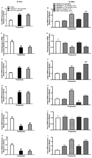 Both in vivo and in vitro treatment with nesfatin-1 and Nlp upregulated preproinsulin (ins) transcript abundance in goldfish adipocytes. In the in vivo treatment, a significant increase in ins mRNA expression was observed in both nesfatin-1- and Nlp-injected groups after one hour (Figure 1A) (p < 0.0001). Similarly, adipose tissue treated with nesfatin-1 and Nlp (10 nmol/L) showed a significant increase in ins transcript abundance after six hours (Figure 1B) (p < 0.0001). However, preproglucagon mRNA was significantly downregulated in adipocytes both in vivo (p < 0.001) and in vitro (p < 0.05) treatment groups (Figure 1C,D). The abundance of pcsk1 and pcsk2 mRNAs, formerly known as PC1/3 and PC2, which are involved in the bioprocessing of preprohormones (including preproinsulin) was significantly upregulated following nesfatin-1 and Nlp administration (P < 0.001) in goldfish adipocytes (Figure 1E,G). Similar to the results of the in vitro treatment, the mRNA abundance of pcsk1 was significantly upregulated after six hours (10 nmol/L) for both nesfatin-1 and Nlp treatment (Figure 1F) (p < 0.001). pcsk2 transcript abundance was significantly upregulated following nesfatin-1 (10 nmol/L, six-hour time point) treatment (p < 0.0001), whereas it was significantly downregulated following Nlp (1 nmol/L, one-hour time point) treatment (p < 0.05) (Figure 1H). IP injection of nesfatin-1 and Nlp significantly downregulated the transcript abundance of insulin receptors insra and insrb (Figure 1I,K). However, in vitro incubation with nesfatin-1 and Nlp significantly upregulated the transcript abundance of insrb at both one (1 nmol/L, p < 0.001) and six-hour time points (10 nmol/L, p < 0.0001) (Figure 1L), where no significant changes were observed for insra (Figure 1J).