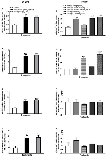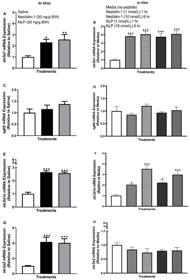 IP injection of nesfatin-1 and Nlp downregulated slc5a1 mRNA in the liver of goldfish (p = 0.0164) (Figure 5A). However, in vitro treatment of nesfatin-1 (p = 0.0002) and Nlp (p = 0.0091) upregulated slc5a1 mRNA in the liver culture at one-hour post-incubation (Figure 5B). Sglt2 mRNA was also downregulated following nesfatin-1 and Nlp injection (p < 0.0001) in the liver of goldfish (Figure 5C). At one hour (1 nmol/L), incubation in nesfatin-1 or Nlp significantly upregulated (p < 0.0001) the abundance of sglt2 (Figure 5D). However, at six hours (10 nmol/L), sglt2 was significantly downregulated (p = 0.0336) following the peptide treatment compared to the control (Figure 5D). Slc2a1a, another glucose transporter, was upregulated at the one-hour time point following nesfatin-1 and Nlp incubation (p = 0.0334) (Figure 5F). However, no significant changes were observed in the transcript profile of slc2a1a following IP injection of either nesfatin-1 or Nlp (Figure 5E). Nesfatin-1 and Nlp downregulated slc2a2 (p < 0.0001) at one-hour (Figure 5G) post-injection. Meanwhile, the Nlp in vitro treatment at the one-hour time point caused a significant increase (p = 0.0145) in slc2a2 transcript abundance compared to controls (Figure 5H).