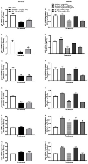 Insulin, growth hormone, and insulin-like growth factor receptor mRNA transcript following in vivo (left panel) and in vitro (right panel) nesfatin-1 and Nlp treatment in goldfish liver. Figure panel represents hepatic transcript profile of igf1 (A,B), igf2a (C,D), ghra (E,F), ghrb (G,H) insra (I,J), and insrb (K,L) post-nesfatin-1 or Nlp treatment. RT-qPCR transcript data are presented as mean + SEM (n = six fish/group, for both in vivo and in vitro groups). One-way ANOVA following Dunnett’s multiple comparisons test (in vivo study) or Tukey’s multiple comparisons test (in vitro study) were used for statistical analysis. Asterisks denote significant differences (* p < 0.05, ** p < 0.001, *** p < 0.0001) between control and treatment groups.