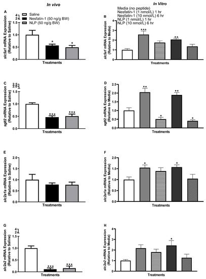 Transcript profile of glucose transporters following in vivo (left panel) and in vitro (right panel) nesfatin-1 and Nlp treatment in goldfish liver. RT-qPCR transcript data of slc5a1 (A,B), sglt2 (C,D), slc2a1a (E,F), and slc2a2 (G,H) following nesfatin-1 and Nlp treatment in goldfish liver. Data presented as mean+ SEM (n = six fish/group, for both in vivo and in vitro groups). One-way ANOVA following Dunnett’s multiple comparisons test (in vivo study) or Tukey’s multiple comparisons test (in vitro study) were used for statistical analysis. Asterisks denote significant differences (* p < 0.05, ** p < 0.001, *** p < 0.0001) between control and treatment groups.