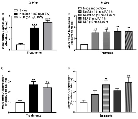 IP administration of nesfatin-1 or Nlp caused a significant increase in the transcript abundance of both insra (p < 0.0001) and insrb (p = 0.0021) in the muscle of goldfish (Figure 8A,C). Similarly, in vitro incubation of goldfish muscle with nesfatin-1 or Nlp upregulated both insra (at both one- and six-hour time points, p < 0.001) and insrb (only at the six-hour time point, p < 0.001) transcripts (Figure 8B,D).