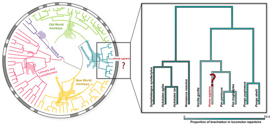 For most arboreal species, some form of suspensory locomotion (i.e., movement below branches) is inevitable when substrate size is small compared to the overall body dimensions [1,2,3]. Brachiation is a form of suspensory locomotion in which weight support and propulsion are achieved solely by the forelimbs [1,4,5]. Such a specialized locomotor mode has only evolved in Primates [5,6], and the propensity for brachiation is observed in nearly all living primate taxa (Figure 1; [4]). The most specialized living brachiators are the non-human hominoids (e.g., gibbons, orangutans, chimpanzees, and gorillas) [6,7,8]. As a group, these species are characterized by a range of anatomical specializations (e.g., long forelimbs, stiff axial skeletons, high mobility at the shoulder joint, and relatively large forelimb flexor musculature) often associated with improving locomotor performance while swinging below branches [7,9,10,11,12,13,14,15]. Odd among the hominoids are anatomically modern humans, which beyond habitual exercise and play [16], have all but abandoned brachiation as a form of locomotion in favor of specialized striding bipedalism. Such a disconnect between the ancestral [2,17,18,19] and modern conditions provides an interesting means to simultaneously test how neuromuscular locomotor patterns are conserved across phylogeny and whether a lack of anatomical specialization influences locomotor performance.
