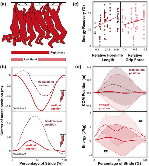 Human brachiation is a slow gait that involves continuous contact with the forelimbs, as seen in the gait cycle (a). Human brachiation is characterized by a range of strategies regarding both tangential and mediolateral movements of the center of mass seen in these representative traces (b). While some individuals adopt the pendulum-like falling and rising of the center of mass with relatively little mediolateral movements (Variation 1), others raise themselves upwards and/or demonstrate substantial mediolateral deviations (Variation 2). Despite these differences in center of mass movements during brachiation, the primary predictor of energy recovery (%) is driven by the forelimb-to-height ratio and relative grip strength, with individuals that have relatively longer and stronger forelimbs achieving greater energy recovery during brachiation (c). Average center of mass positional traces (in meters) with shaded standard deviation bars in the vertical and mediolateral planes (top) across a stride (d). Average kinetic (KE) and potential (PE) energy (in J/kg) traces with shaded standard deviation bars (bottom) across a stride. Standard deviation bars are enclosed with the same line marking as the average trace line (e.g., mediolateral position standard deviation is enclosed in dashed lines, matching the mean trace).